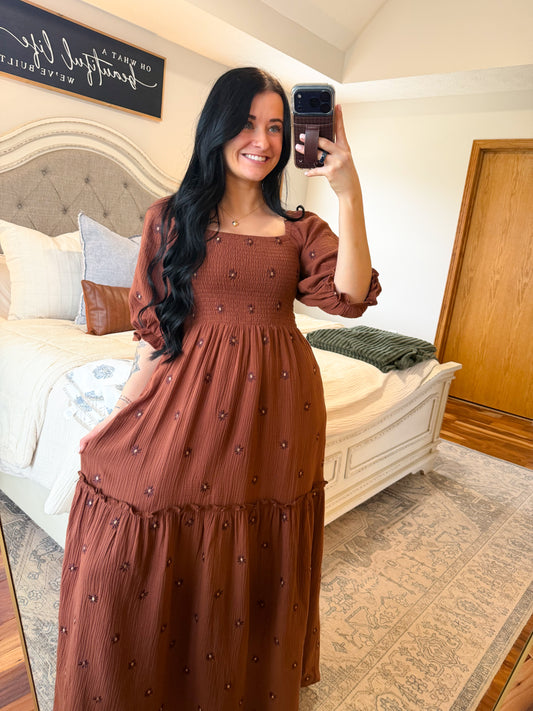 Rosey Floral Embroidered Maxi Dress- Chocolate