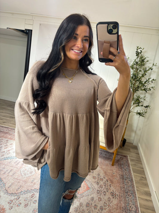 Tiered Baby Doll Bell Sleeve Top- Tan