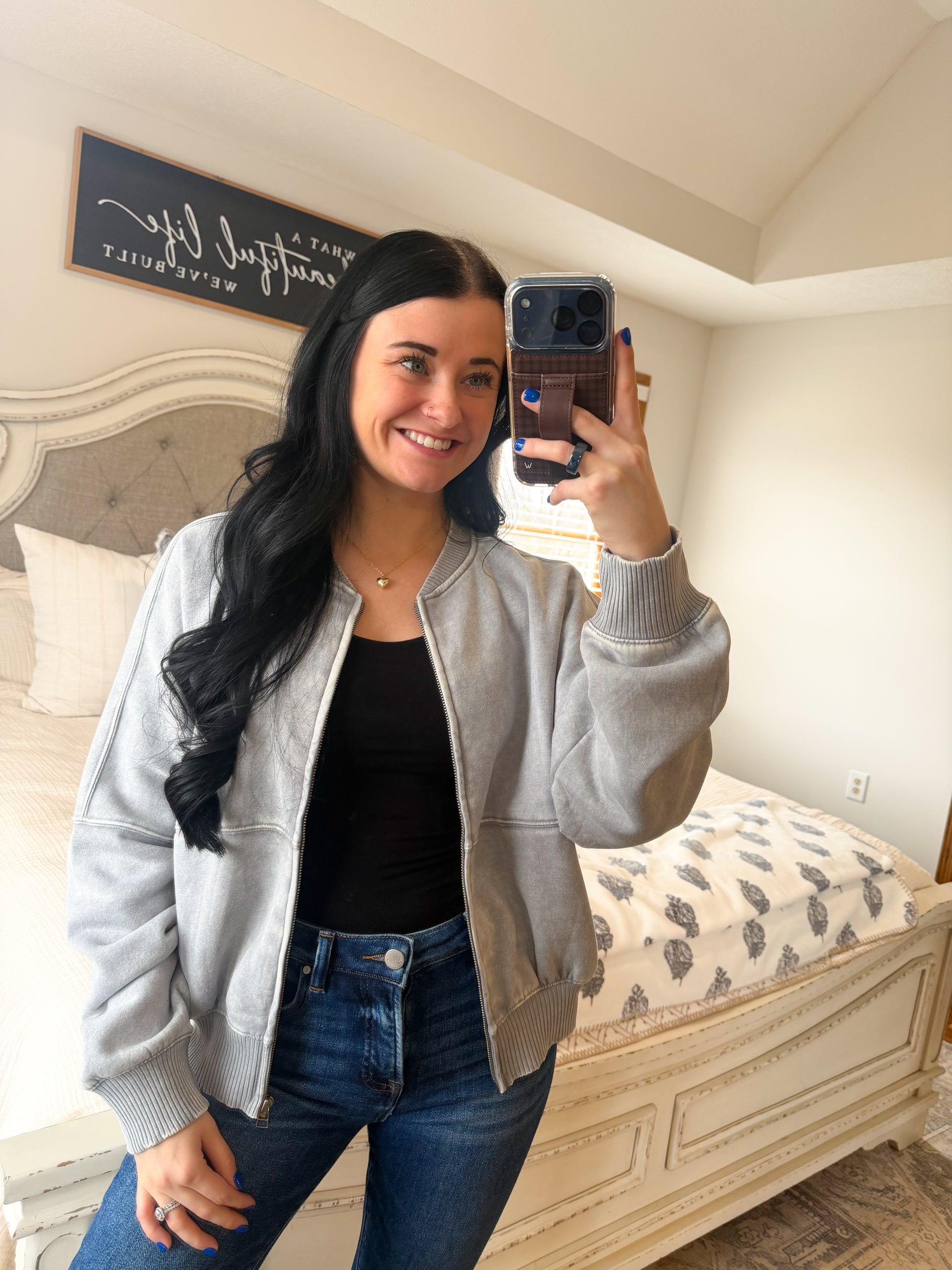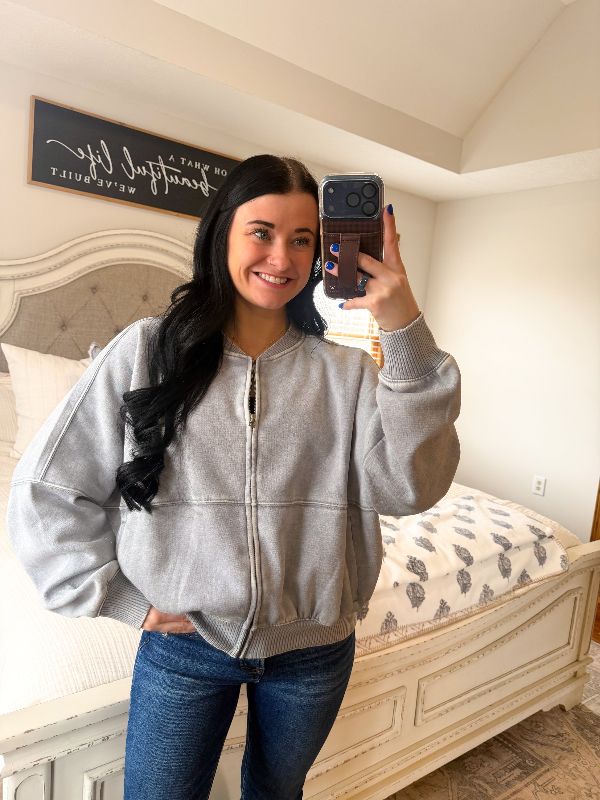 Elevate your style with the Bomber Jacket in Sleet! Its flattering fit hugs your silhouette beautifully while the chic vibes embody effortless elegance. The neutral color adds versatility, making it an essential piece for any wardrobe.