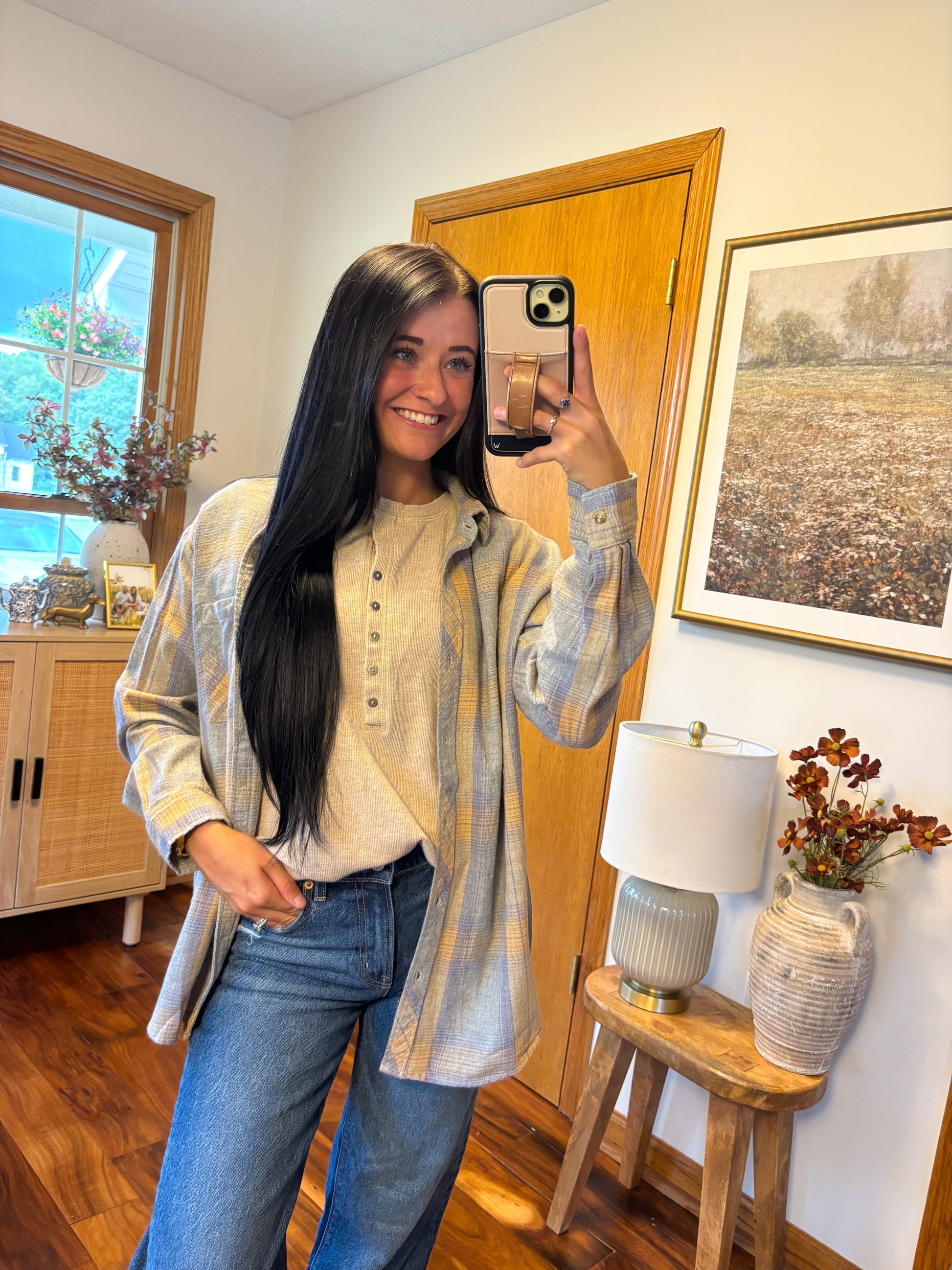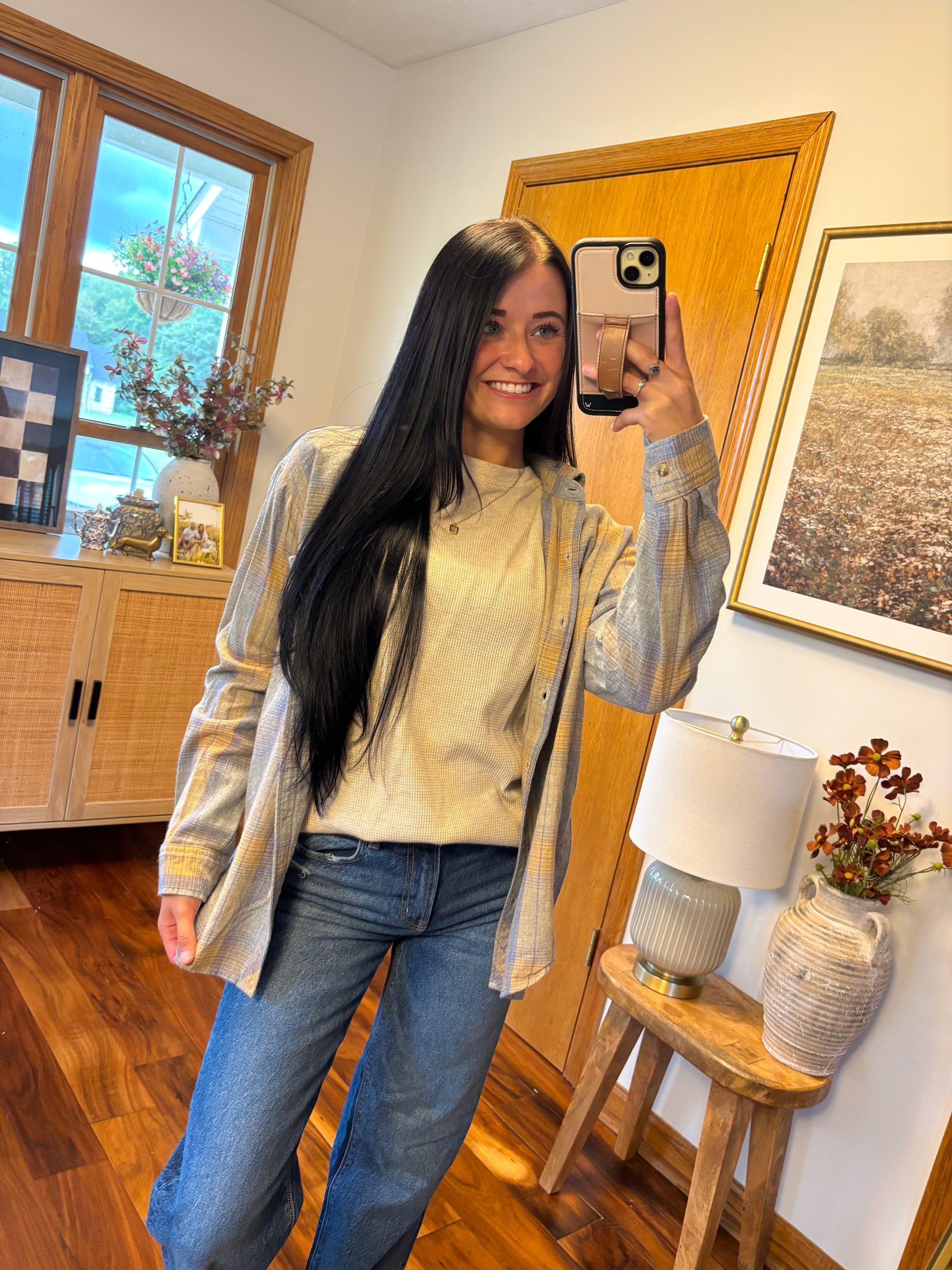 Stay cozy and stylish on chilly days with our Flannel Top in Blueberry. Featuring a cool grey and blue color scheme with a pop of vibrant orange, this perfect flannel will keep you warm and fashionable.