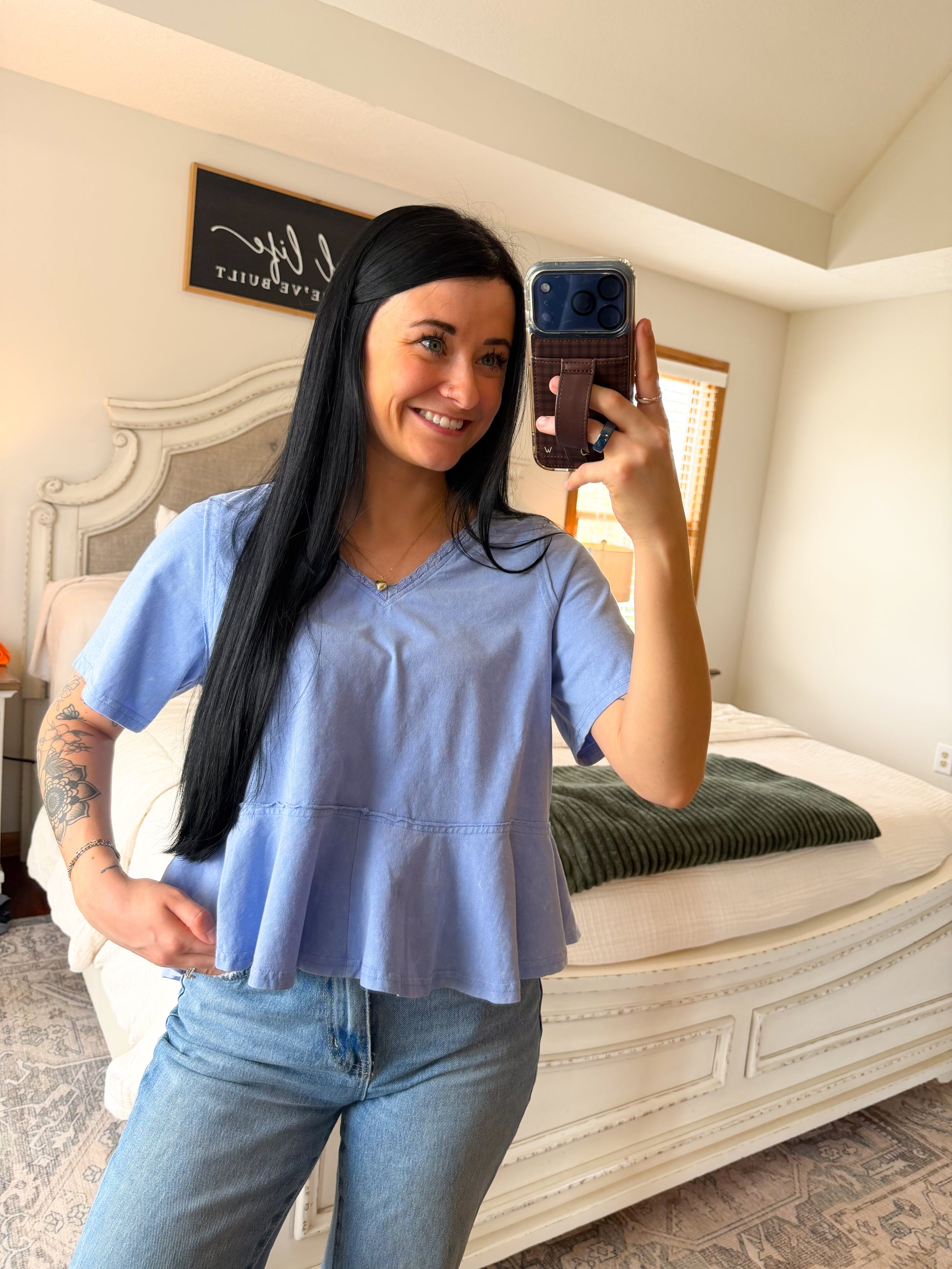 Elevate your wardrobe with the Laney Knit Top in a stunning periwinkle hue! The delicate lace trim and playful ruffled hem add a touch of elegance, making it perfect for both casual outings and special occasions.