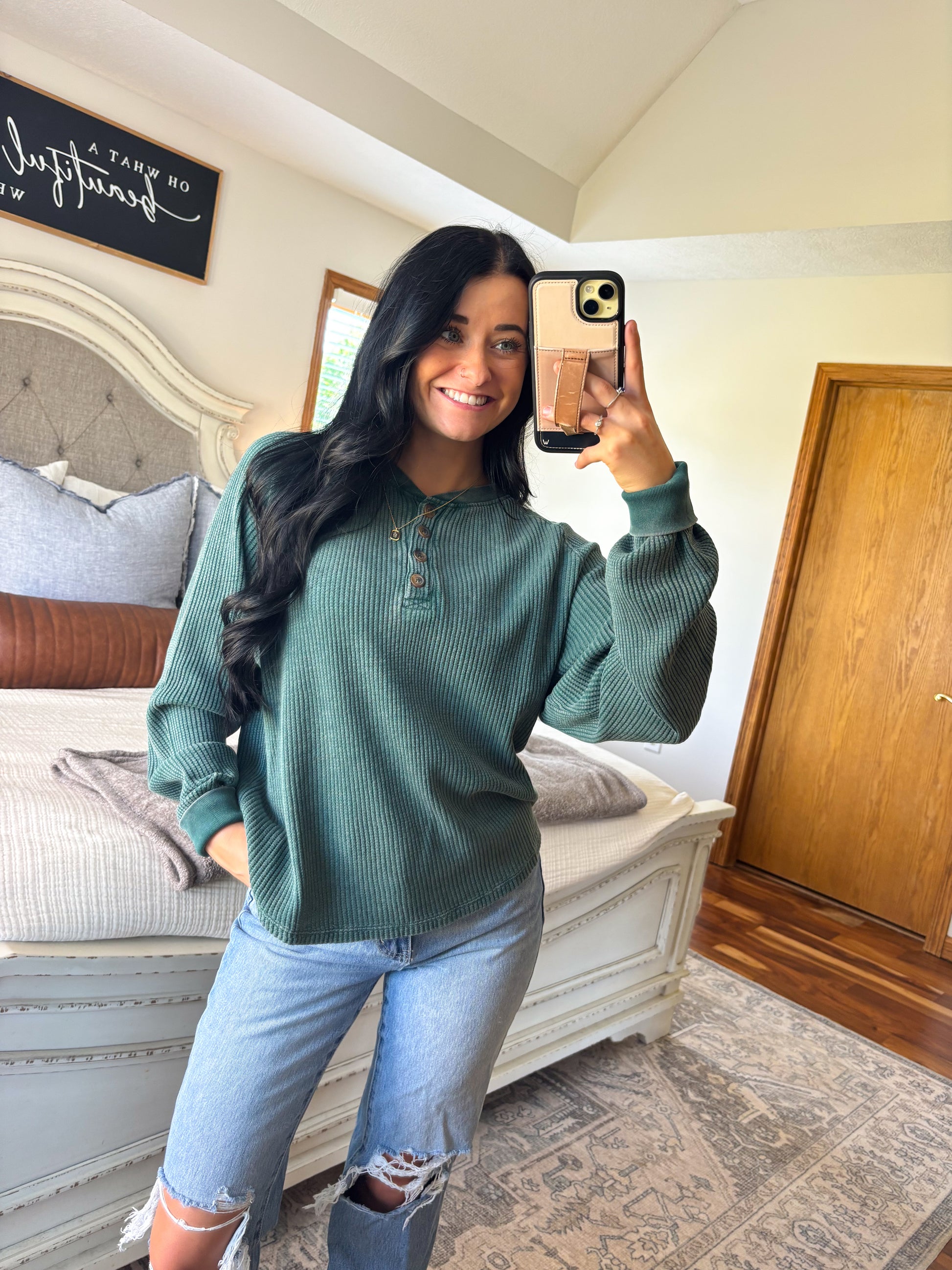 Elevate your wardrobe with our Lottie Henley Top in Hunter Green! This versatile piece is perfect for layering and boasting a beautiful, rich color. Dress it up or dress it down for a casual day look. Be stylish and effortless with this must-have top!