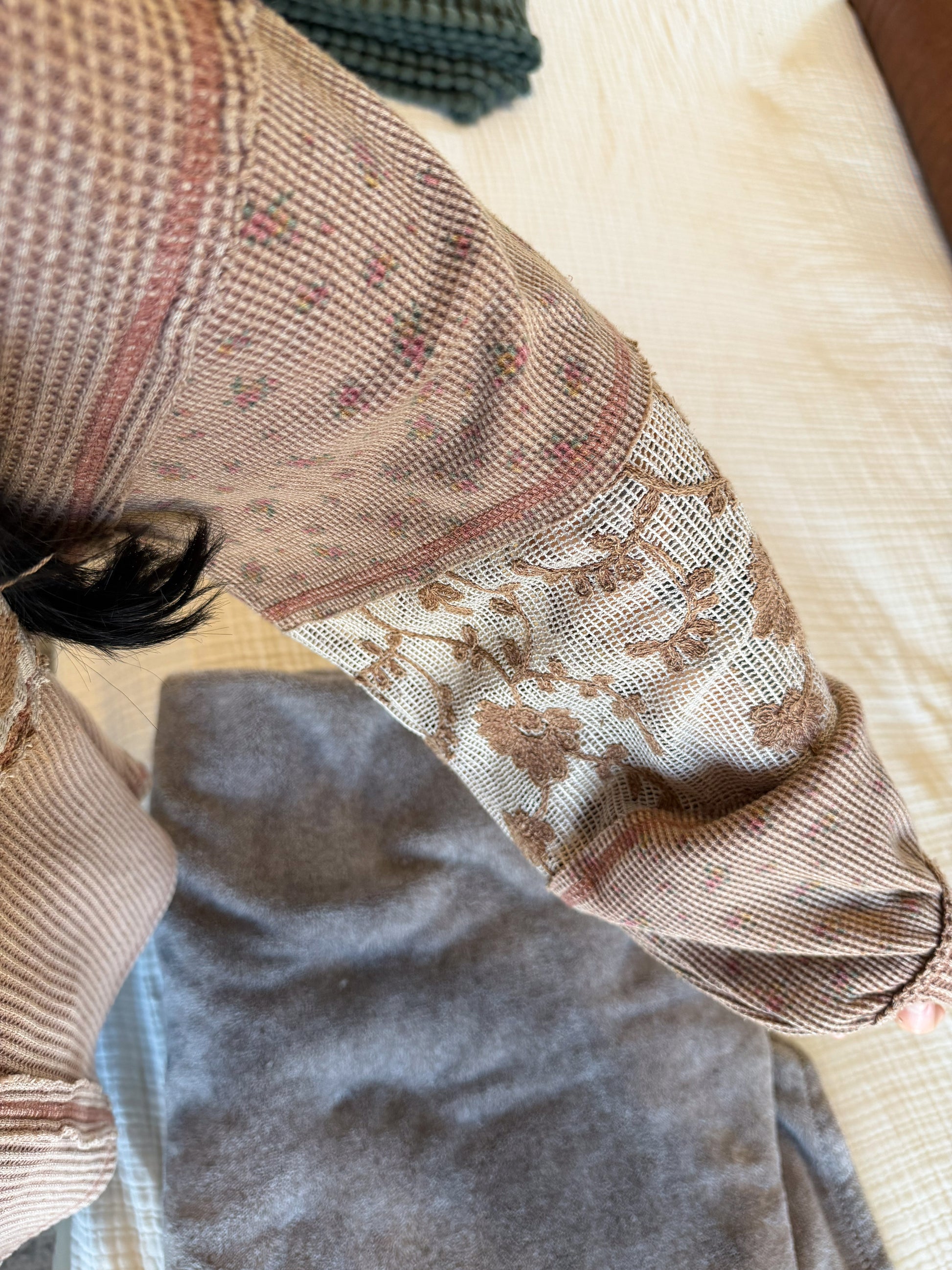 Experience the perfect blend of style and comfort with our Mocha Mix Thermal Pullover. The lightweight and relaxed fit allows for ease of movement while the contrasting floral lace overlay adds a touch of elegance. The waffle knit texture provides both warmth and a unique look.