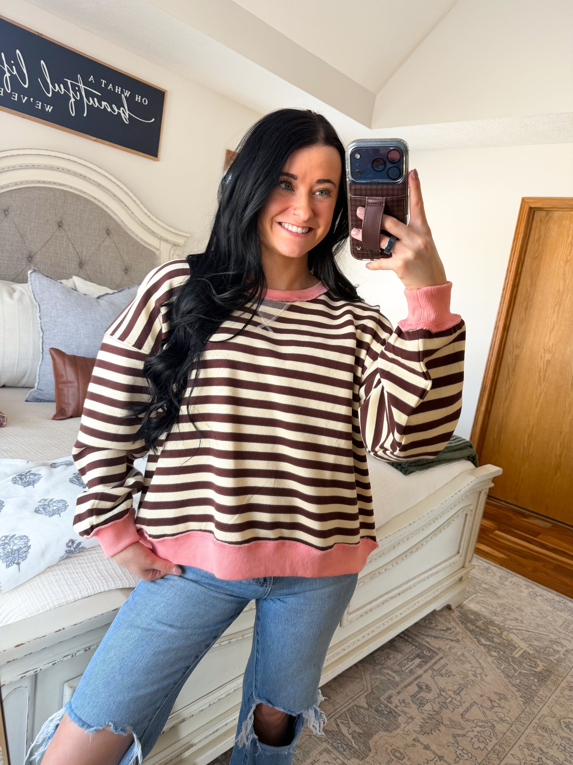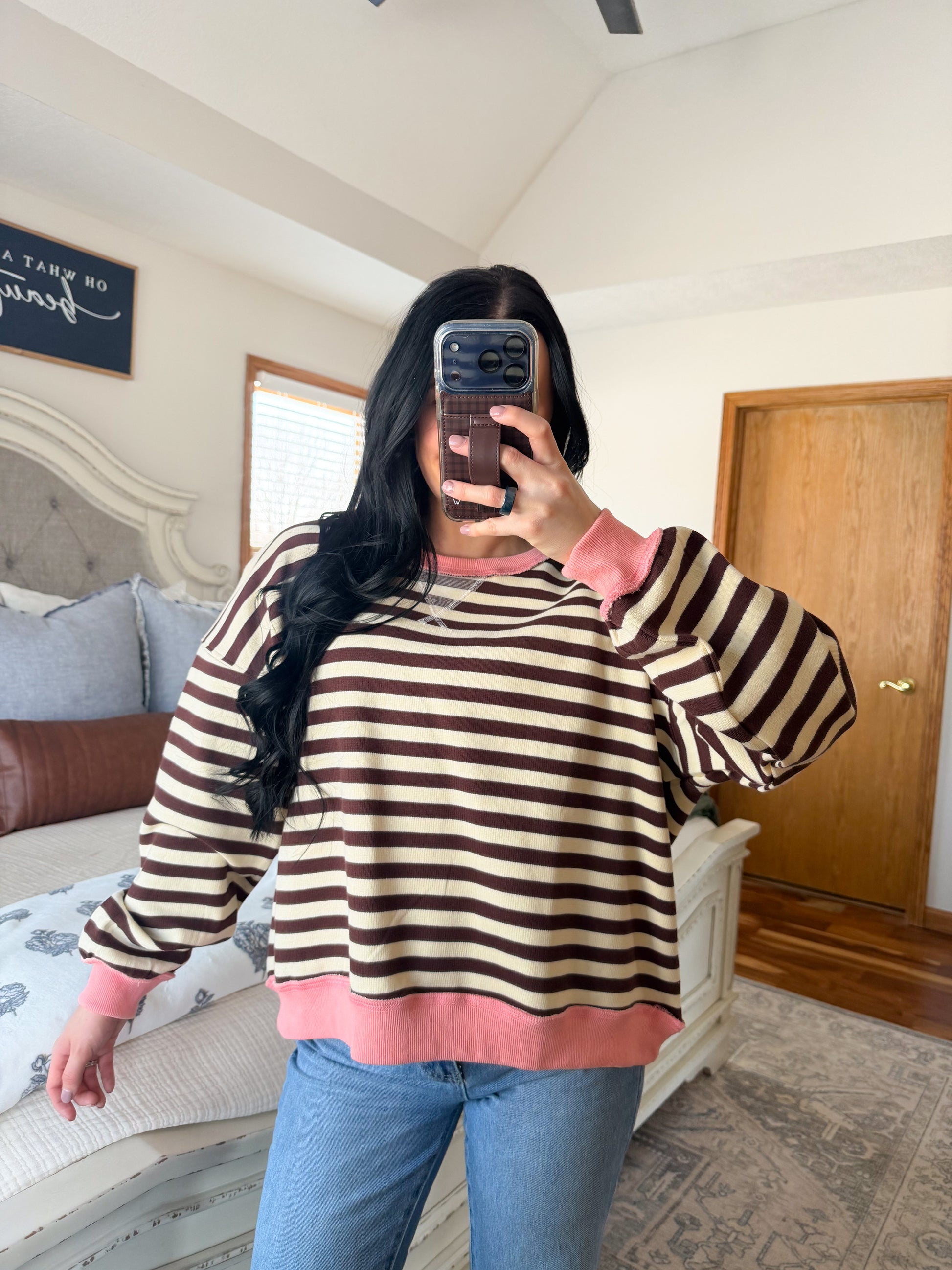 Experience the ultimate comfort with our Pink Stripe Pullover. Made with a perfect combination of pink and chocolate Teddy brown, this pullover is sure to be your new favorite!