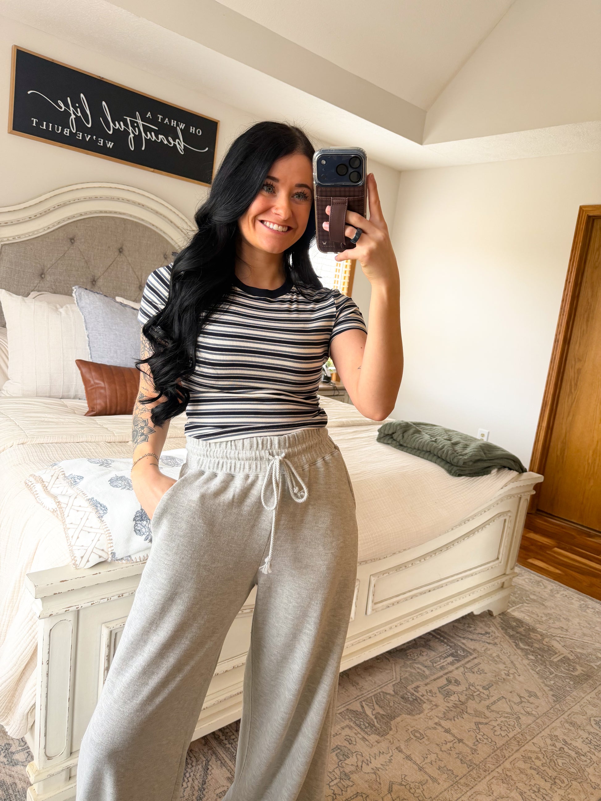 Elevate your wardrobe with the Striped Baby Tee in Navy. The soft ribbed fabric ensures comfort, while the trendy stripes add a stylish flair. Its ideal length makes it versatile for any outfit.