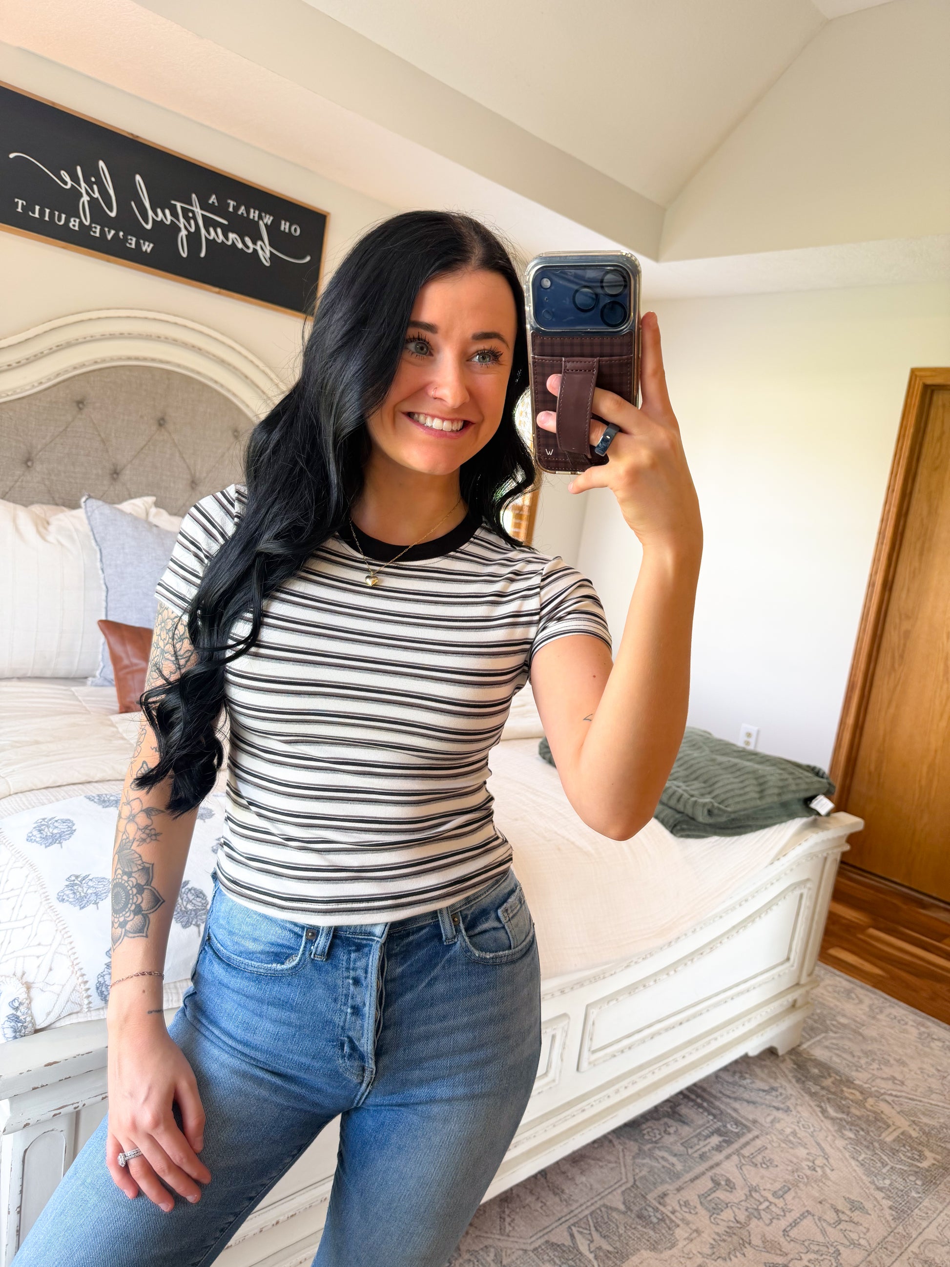 Elevate your wardrobe with the Striped Baby Tee in Taupe/Grey. The soft ribbed fabric ensures comfort, while the trendy stripes add a stylish flair. Its ideal length makes it versatile for any outfit.