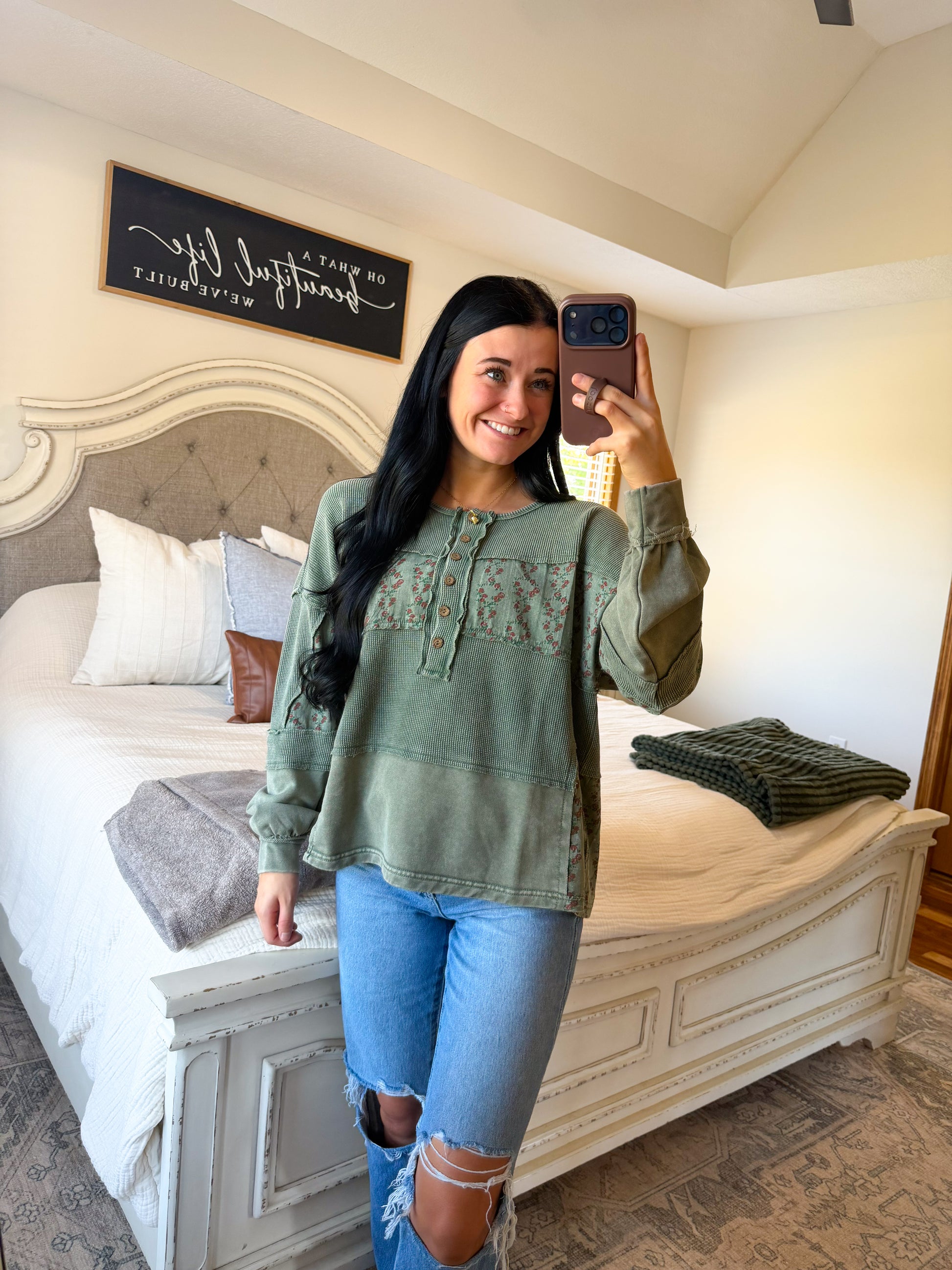 Indulge in the perfect blend of style and comfort with our Mixed Media Sweater in Pine Green. Crafted with a mix of materials and adorned with charming floral details, this sweater is sure to make a statement. Complete with functional buttons, it offers both function and fashion.