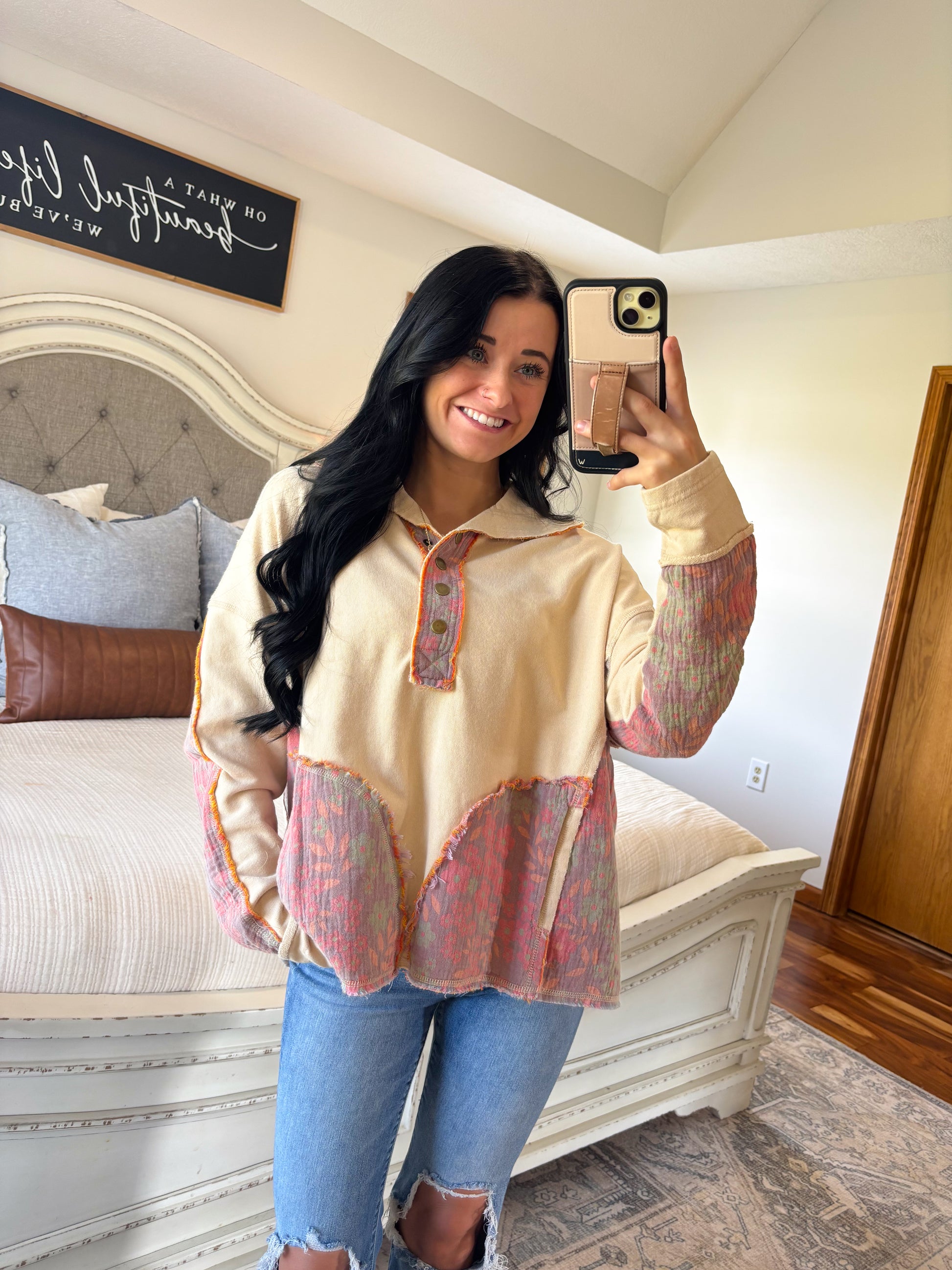Upgrade your wardrobe with the Clara Pullover in Oatmeal. Made from soft French terry material, this pullover is accented with elegant gold snaps and a lovely floral contrast. Elevate your style with this comfortable and chic piece.